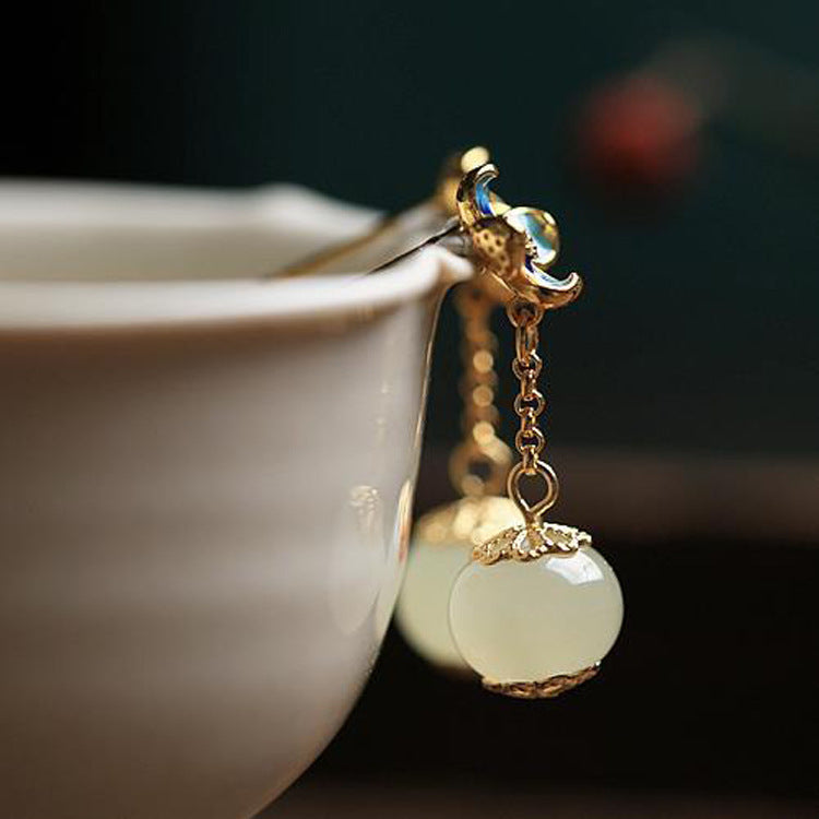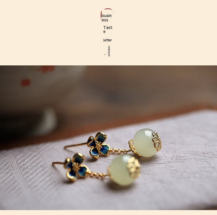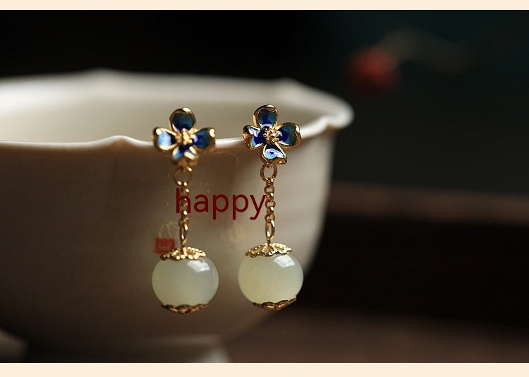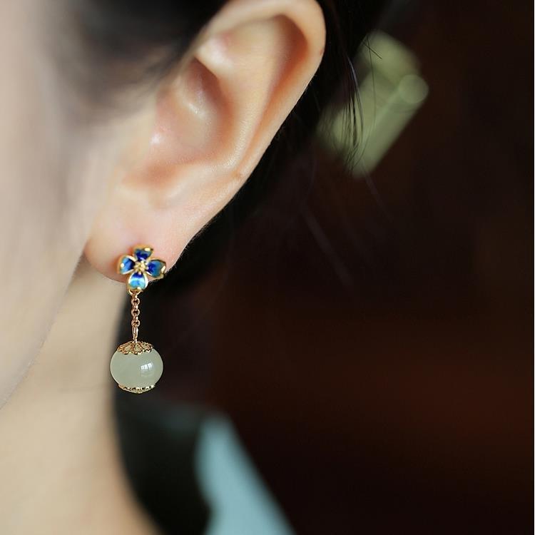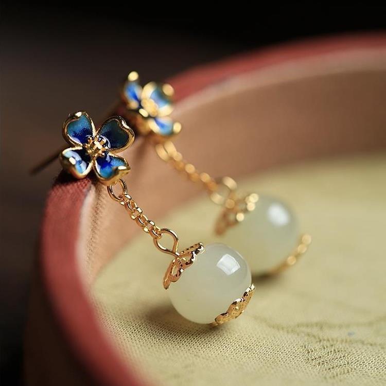 These earrings feature milky white stone beads accented with tiny, hand-painted blue flowers. The gold filigree adds a touch of vintage charm. These are perfect for adding a subtle yet sophisticated touch to any outfit.