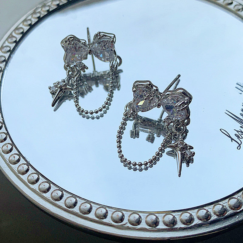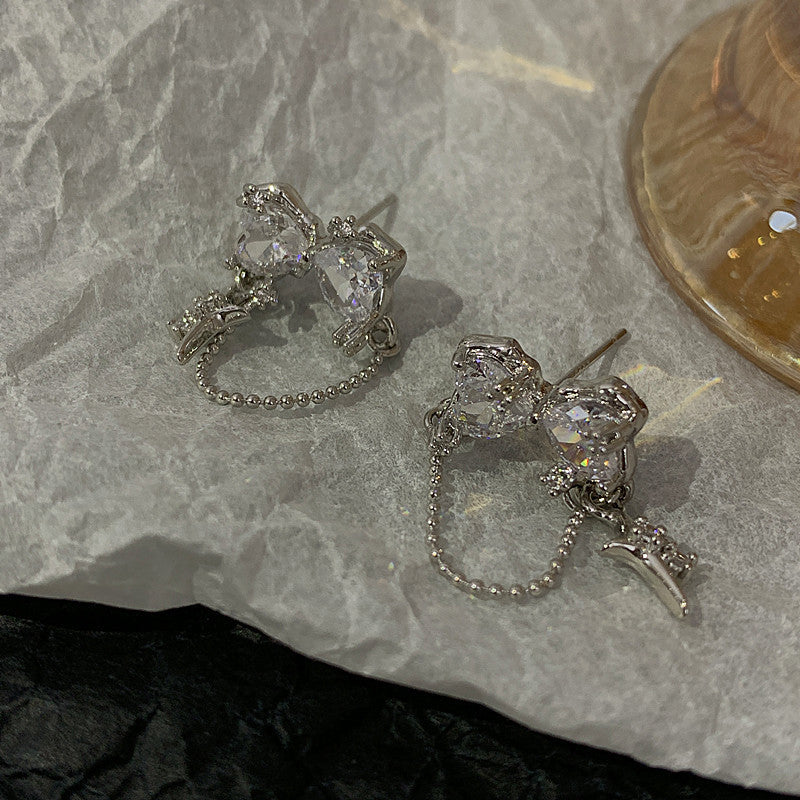 Each earring features two sparkling heart-shaped charms delicately connected by a chain, creating a mesmerizing, cascading effect. The exquisite craftmanship and shimmering cubic zirconia stones add a touch of timeless beauty to any outfit.
