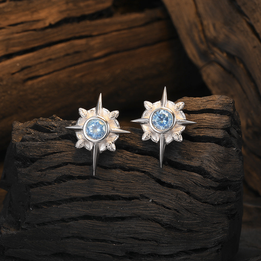 These handcrafted Celestial Starburst earrings feature dazzling blue gemstones set in a radiant starburst design. Each earring is meticulously crafted for a look that's both celestial and chic. A perfect blend of modern style and timeless elegance.